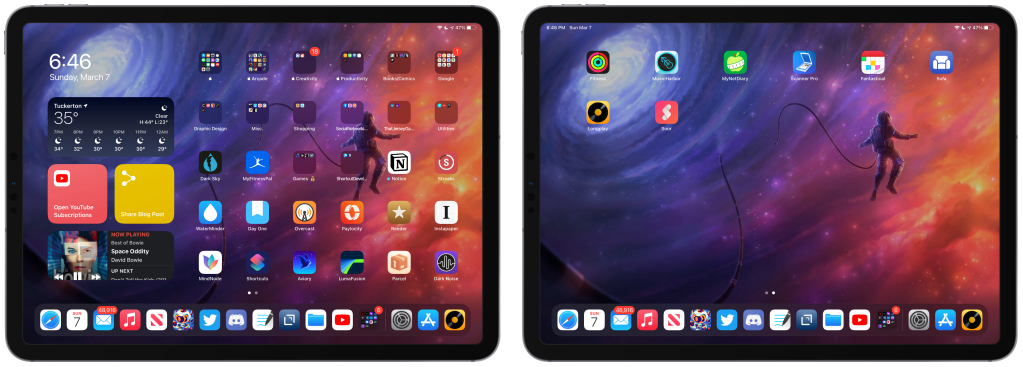 From what I can tell, the widgets are scaled to more or less the same size and there’s plenty of space on the iPad Home Screen to accommodate a mix of widgets and apps.