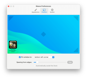 For me personally, I keep Sleeve pinned on the lower left corner of my monitor and do my best to arrange my windows so that the information provided is never obscured. If for some reason I accidentally throw an app over it in the rare cases where I’m working with one or two apps that are taking up my entire screen, I have it set to hover for two seconds when a new track starts.