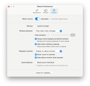 The most recent update also added a feature that I really like: if nothing’s playing, you can tell Sleeve to hide itself! That was one feature I had really been hoping the developer would add, as starting music playback isn’t always the first thing I do when I sit down with my computer, so having the unused Sleeve window there was kind of annoying. I could have just not had the app launch at startup, but then that would once again create friction between hitting play and being able to keep an eye on what’s playing. I absolutely prefer frictionless workflows whenever possible.