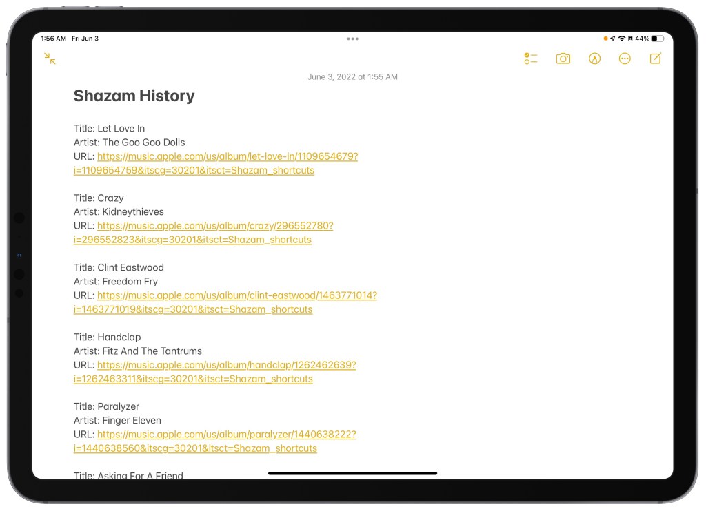 Now don’t get me wrong, the Notes app is one that a lot of people, myself included, would like to see updated in iOS 16, along with a bevy of updated shortcuts actions, but fortunately, for a simple, quick to sync Shazam list, the current state of the app is acceptable. I would have preferred to have been able to pass in some formatted rich text, but my basic text I’ve passed in for now is just fine.
