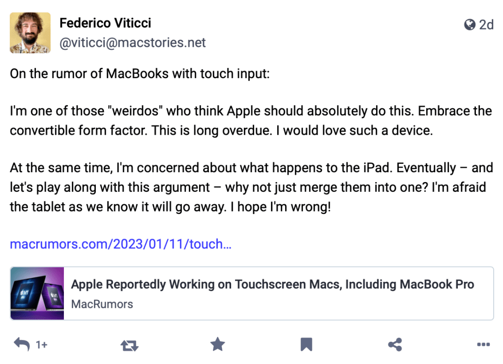 Mark Gurman is reporting that Apple is reportedly working on touchscreen Macs. I stumbled upon this article over on Mastodon, when shared by MacStories founder and Editor-in-Chief, Federico Viticci. Alongside the article, he shared his concern about what a touch screen Mac could mean for the iPad line. I went ahead and responded to him with a few of my thoughts, but really wanted to expand on things just a bit here.